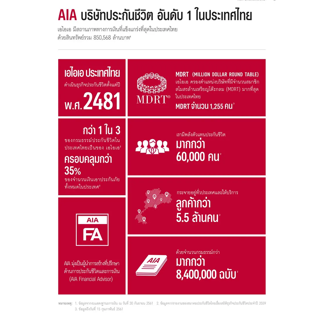 1. AIA เป็นบริษัทที่เป็นผู้นำในอุตสาหกรรมการเงิน ประกันชีวิต และ ประกันสุขภาพ ดำเนินธุรกิจมาอย่างยาวนานกว่า 80 ปีในไทยและกว่า 100 ปีในระดับโลก จากความไว้วางใจของคนไทยกว่า 5 ล้านคน, ลูกค้าองค์กรมากกว่า 12,000 องค์กร เป็นจำนวนกว่า 8 ล้านกรมธรรม์ คิดเป็นกว่า 1 ใน 3 ของกรมธรรม์ทั้งหมดในประเทศไทย