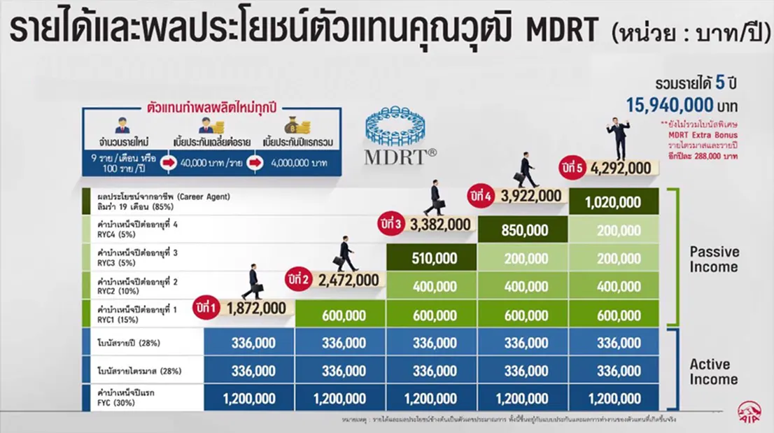 การเติบโตในเส้นทางสายอาชีพมีทั้งการเติบโตเพื่อพัฒนาไปเป็น ตัวแทนประกันชีวิตระดับสากล MDRT ซึ่งเป็นคุณวุฒิของตัวแทนประกันชีวิต และที่ปรึกษาการเงินที่ได้รับการยอมรับในระดับโลก