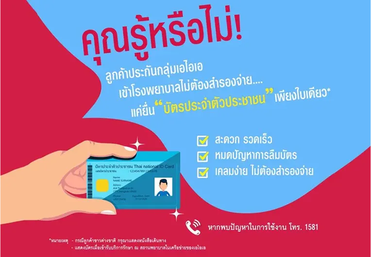 - ง่ายต่อการใช้บริการ ไม่ต้องสำรองค่าใช้จ่าย เพียงแค่ยืน “บัตรประชาชน” เมื่อต้องเข้ารับบริการที่สถานพยาบาลเครือข่ายของ AIA กว่า 500 แห่งทั่วประเทศ